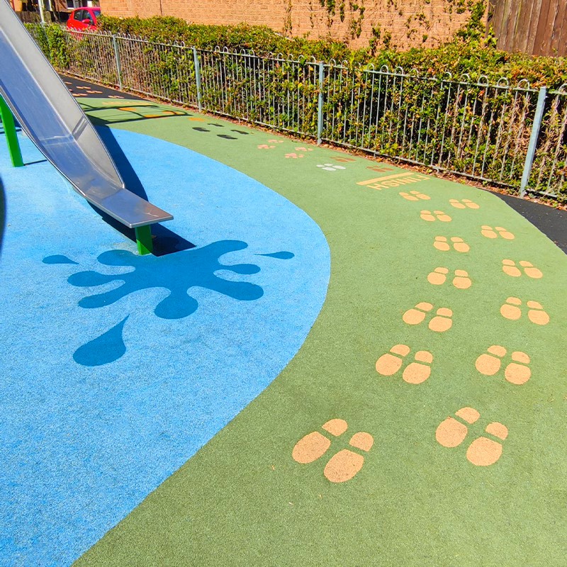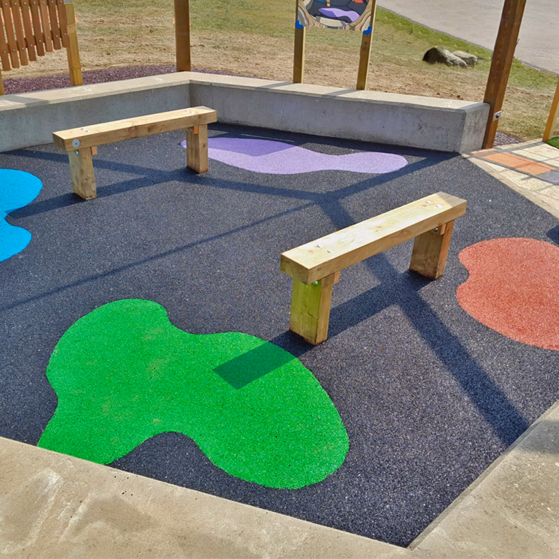 The top layer, made from EPDM rubber, comes in a wide range of colours including black, red, green, blue, beige, purple, eggshell, brown, and yellow. Flecked patterns can be created by combining black with other colours, and custom graphics can be added to enhance playground fun.